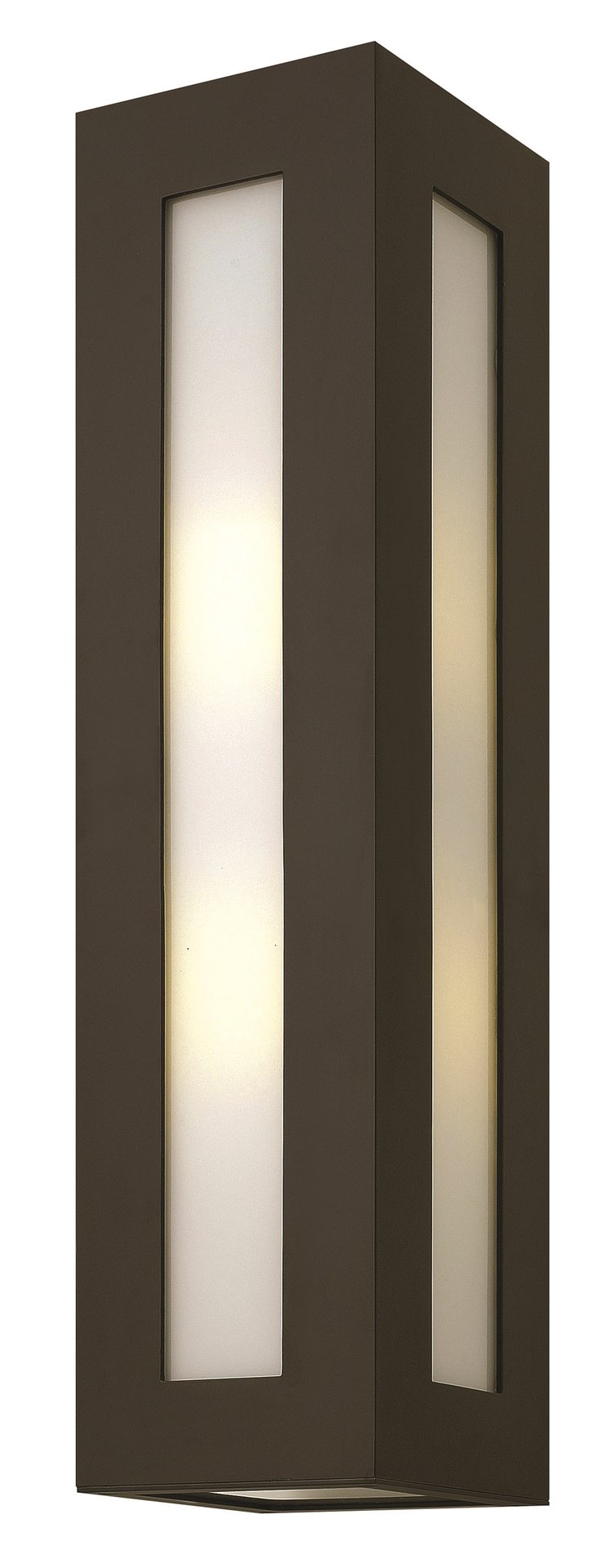 Dorians robust design in durable aluminum construction is offered in either Titanium or Bronze finishes. This contemporary fixture allows light to emit from white etched glass windows.