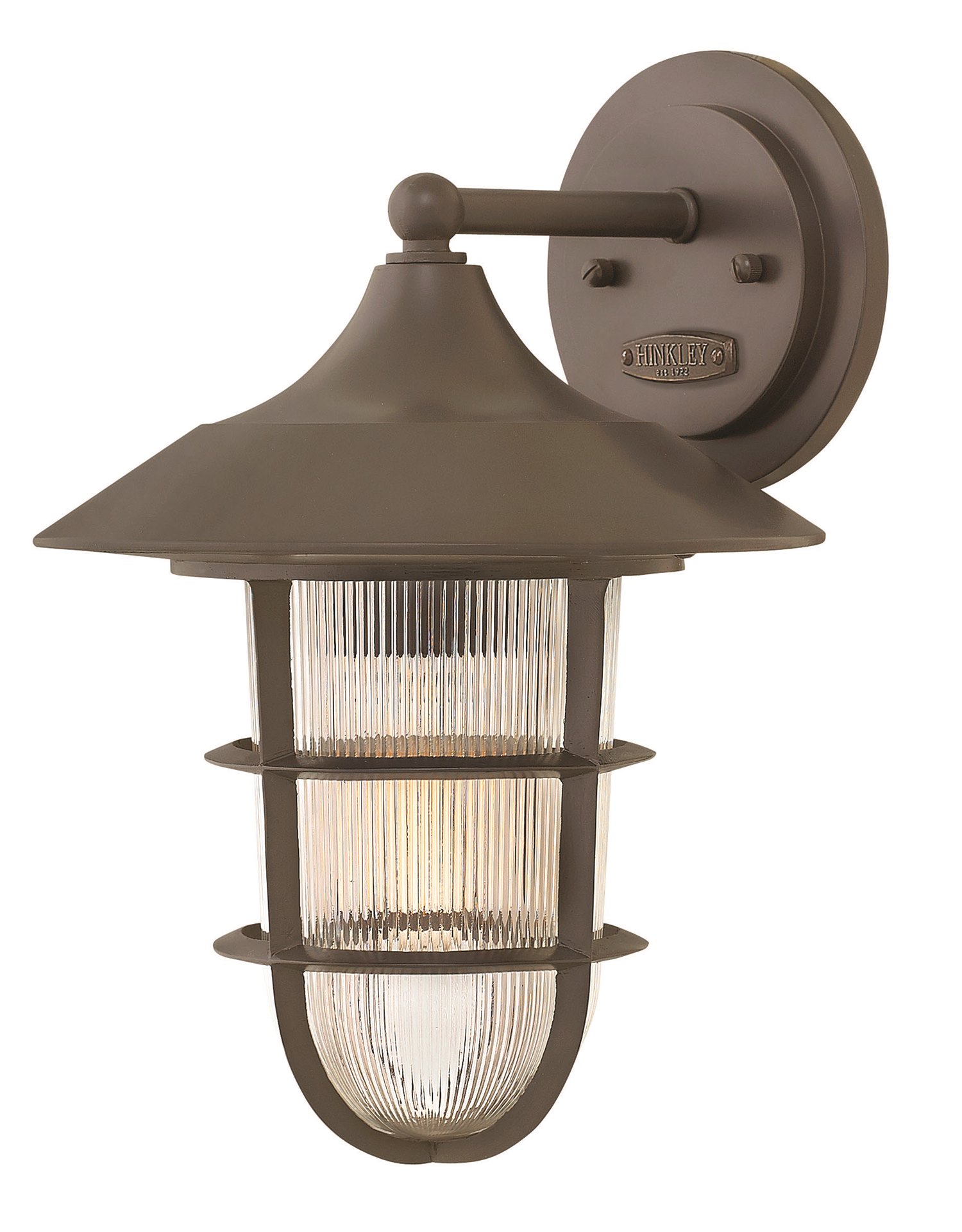 Set sail with Marina. Inspired by authentic ship passageway lighting, its die-casted aluminum construction uniquely emphasizes the captured etched holophane or clear holophane glass. Robust finish options include Bronze or Hematite and showcase the fresh, modern-nautical cast cage design.