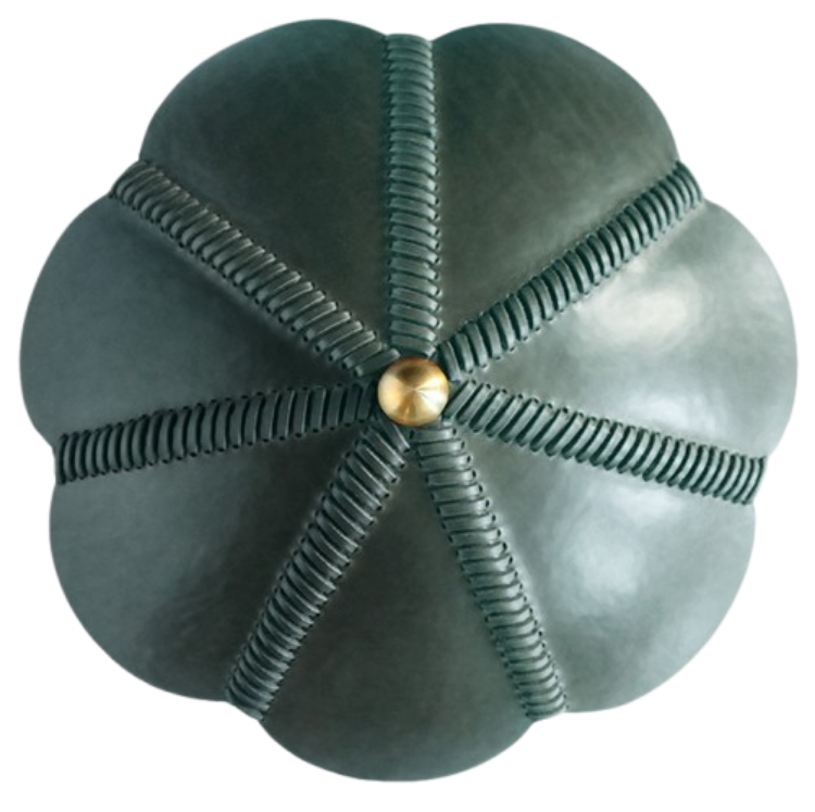 Each lamp is crafted from natural grain board-formed leather, guided by the same formation techniques as those used in fashioning saddles, layered with a jewel-toned color palette and curves inspired by the works of Colombian artist Fernando Botero.