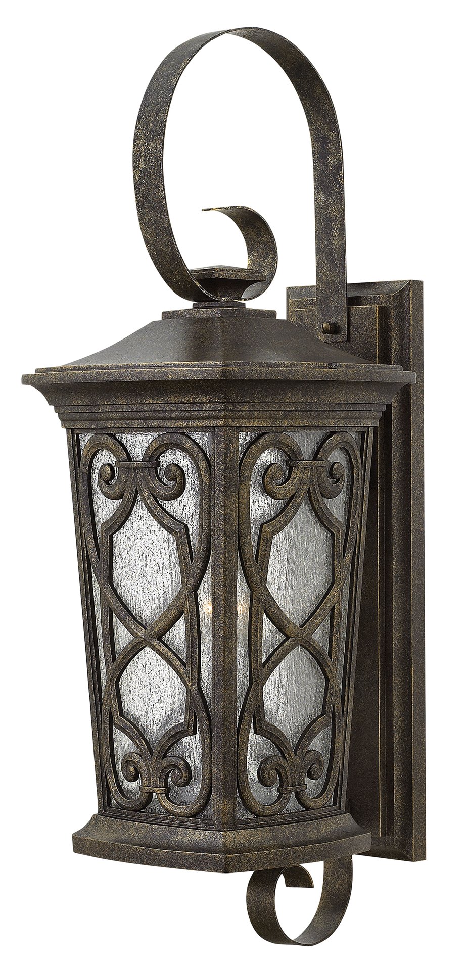 Enzo is inspired by a romantic lantern design. Blending beauty and durability, the intricately die cast aluminum construction features graceful scrolls with Old World allure while the rich Autumn finish and clear seedy glass meld timeless elegance.