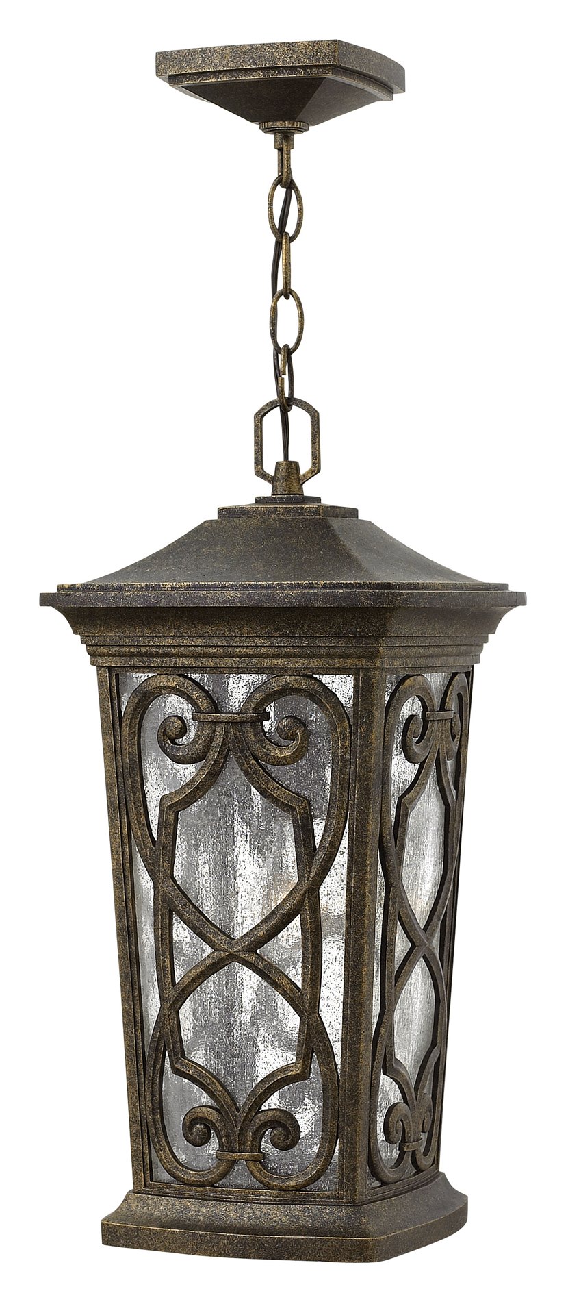 Enzo is inspired by a romantic lantern design. Blending beauty and durability, the intricately die cast aluminum construction features graceful scrolls with Old World allure while the rich Autumn finish and clear seedy glass meld timeless elegance.