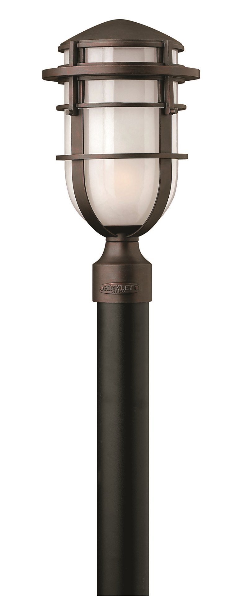 Reefs contemporary nautical shape features a sleek capsule of inside etched glass captured by bold rings of cast aluminum.