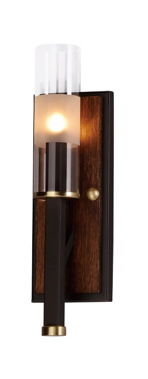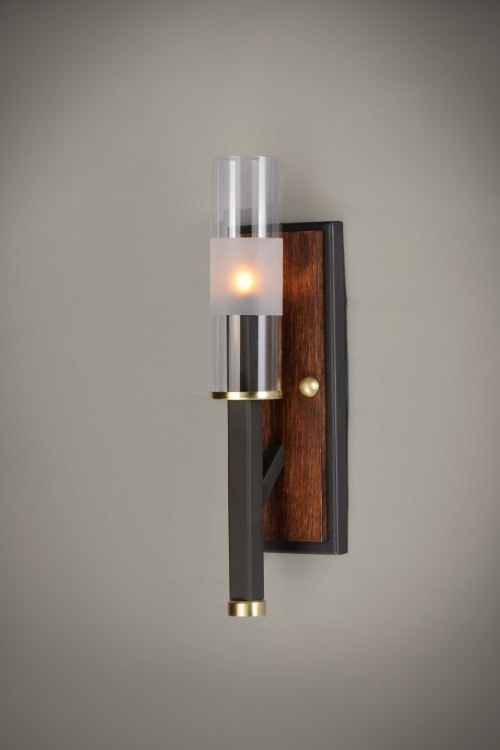 A modern classic created using mixed medium in complimentary finishes that come together to compose a beautiful art form. Available in your choice of Wenge wood with Black and Polished Nickel accents or Antique Pecan wood with Bronze and Satin Brass. Tall Clear glass cylinders with a frosted band complement the scale of the design.