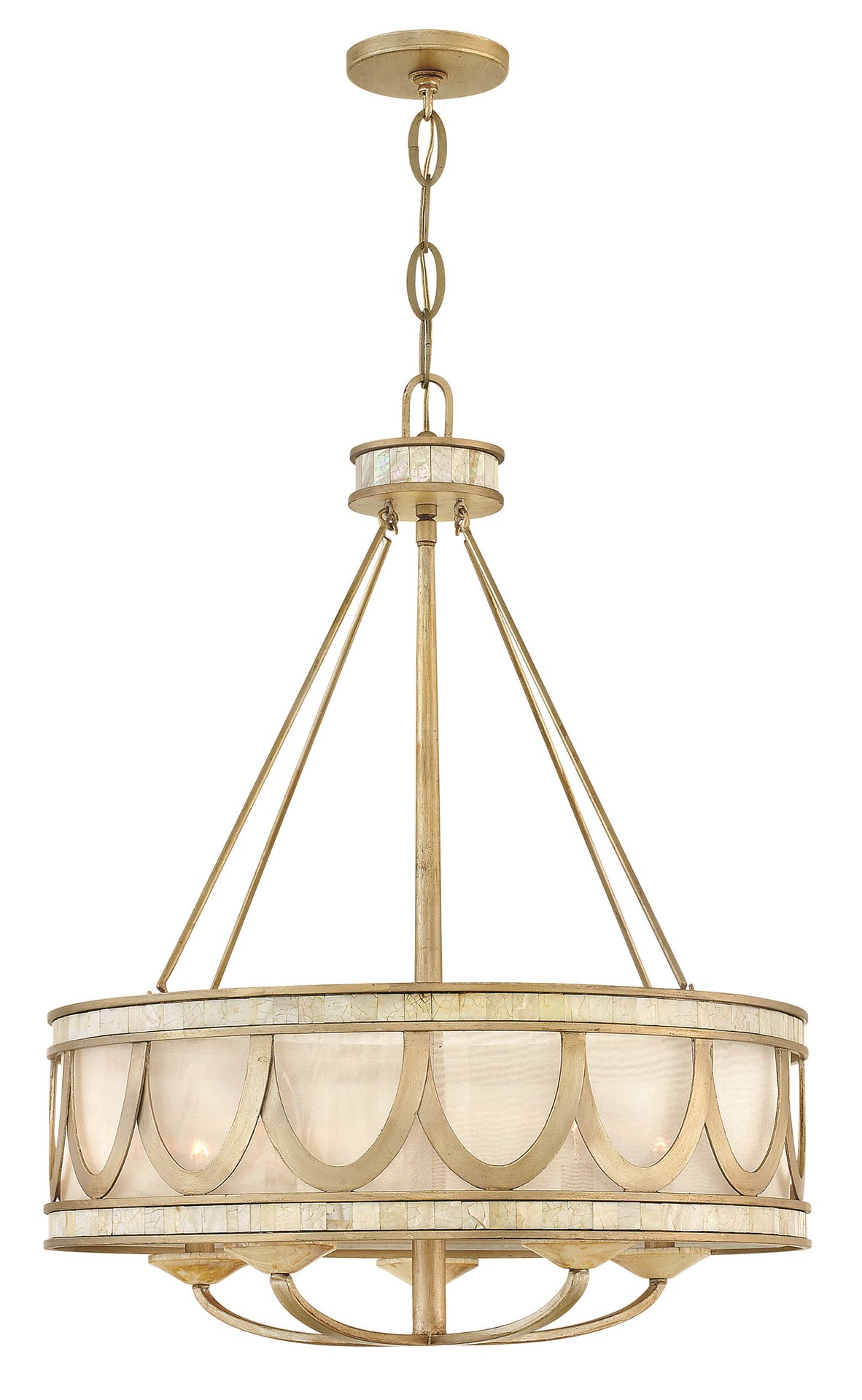 Sirena exudes European sophistication in this transitional collection, detailed with classically inspired natural elements. An outer frame of inlaid cabibe shell captures a fluid wavelike pattern in hand-applied Silver Leaf. A gracefully tapered center column seamlessly transitions to curved candelabra arms with cabibe bobeshes beneath an Oyster organza drum shade.