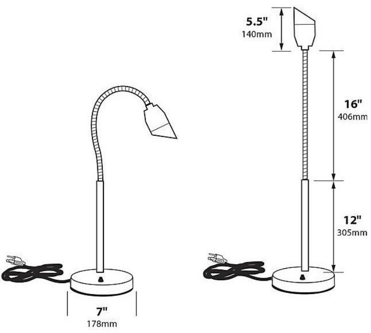 CONSTRUCTION: 316 stainless steel housingARM: 12″ tall 316 stainless steel rigid stem with a 16″ stainless steel flex arm on top and clear weatherproof polyolefin cover over flex armMOUNT: 7″ weighted baseFINISH: Stainless Steel – BrushedLENS: High impact clear tempered flat glassO-RING: High temperature red silicone, 70 durometerSWITCH: On/Off push button with weatherproof rubber boot coverLED SUPPLIED: 7w ARROW PAR16 (L-134)40,000 hours average ratingSOCKET: High temperature ceramic Base (E26/27) medium base,250°C silicone insolated lead wiresWIRING: 9 foot grounded 120v power cord