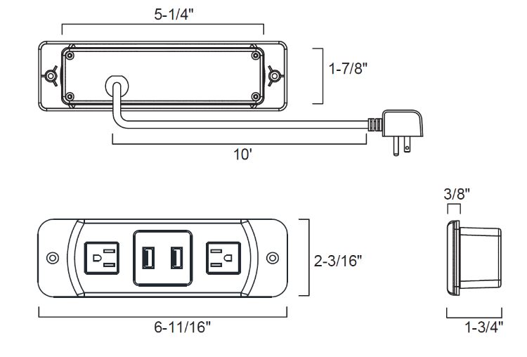 USB Combo Three Prong US Flat Plug 10' Desktop Duplex Power Outlet