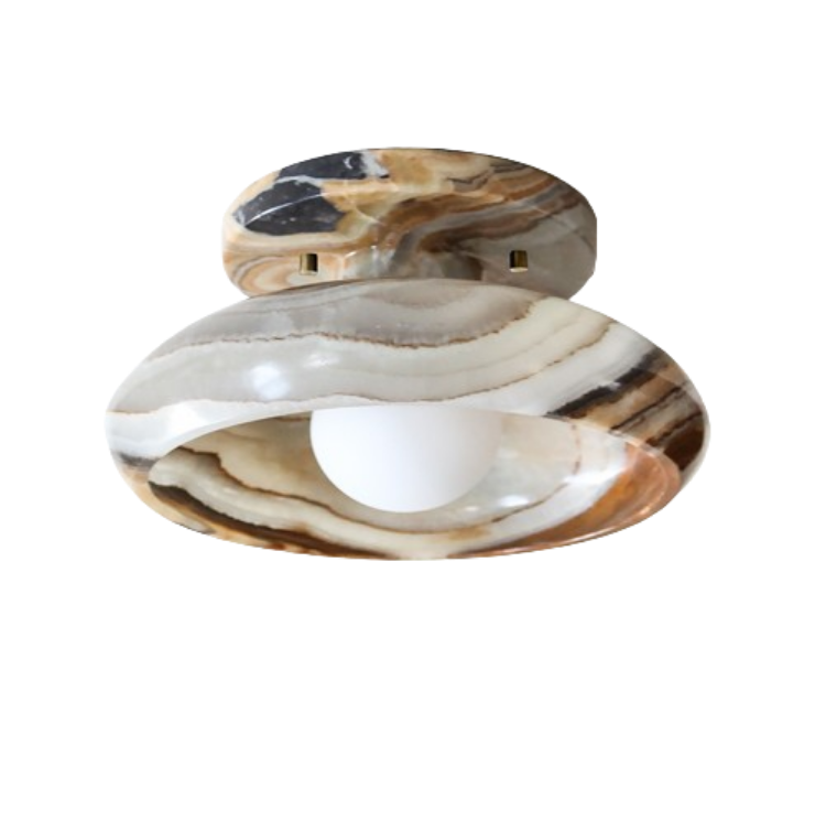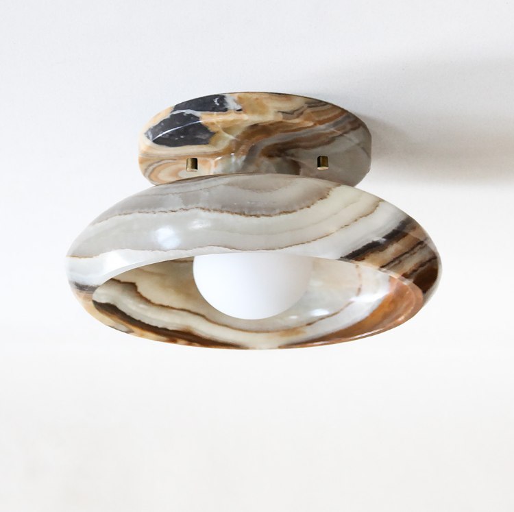 Piedra wall sconces and semi-flush mount lights are carved in the Mexican city of Tecali -‘stone house’ in Náhuatl. Inspired by pre-Colombian Teotihuacán stone masks, drawing on their clean lines, defined angles, and streamlined silhouettes. Sculpted from carefully chosen marble or onyx, each piece reflects the unique character of the individual stone from which it is formed.