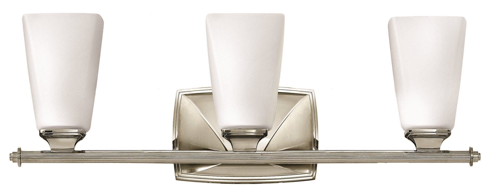 Darby�s traditional flair will complement any d�cor with a precision die-cast zinc back plate, arm, cup and end caps in a flawless Polished Nickel, Brushed Nickel, or Brushed Caramel finish. A thin reeded �bar� effortlessly balances tapered square etched opal shades for an alluring effect.