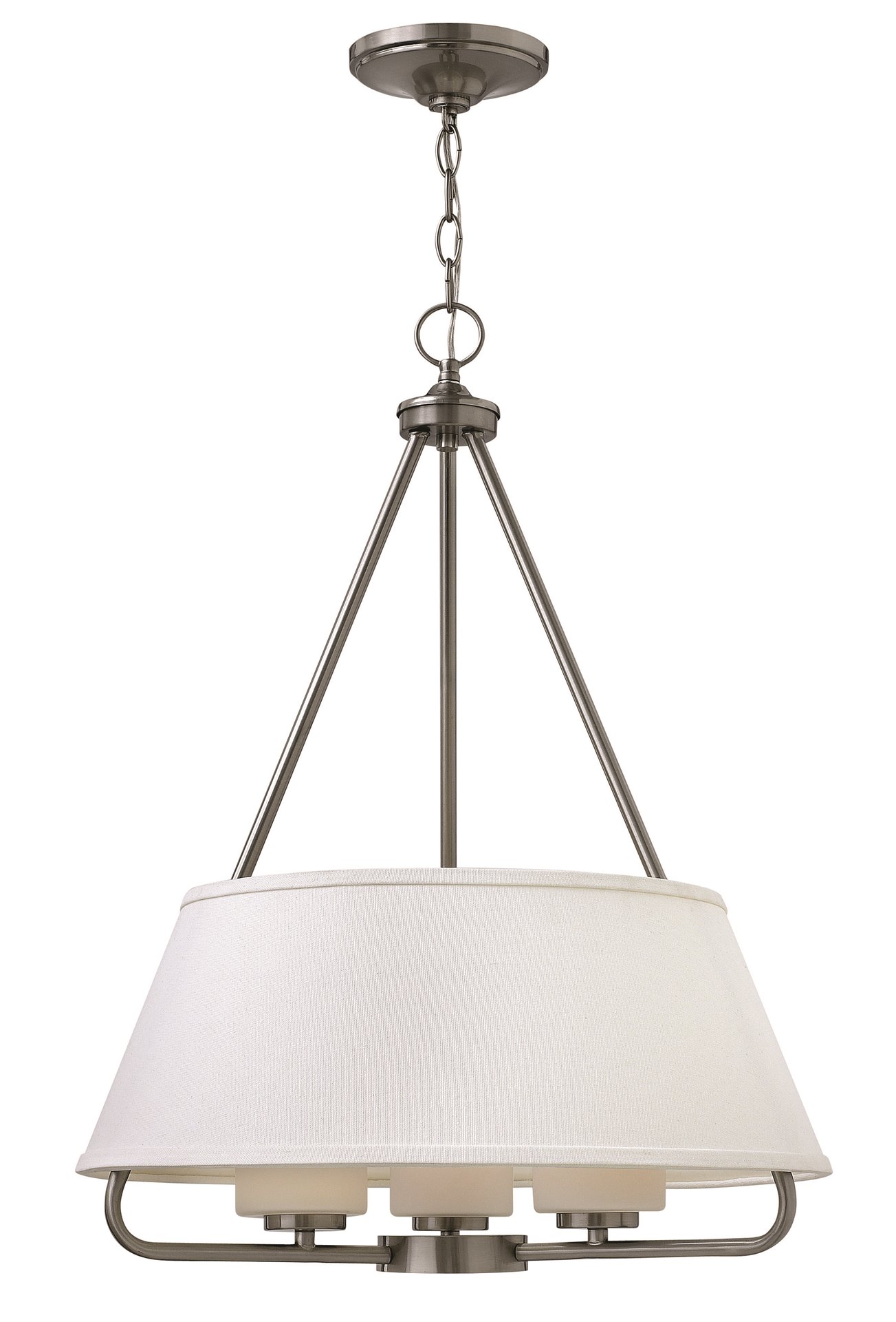 Cole�s soft contemporary silhouette centers on its clean form. An open center ring, softly rounded Brushed Nickel frame, conical white linen drum shade and circular interior etched opal glass shades come together to create a subtlety modern style that complements a variety of interiors.