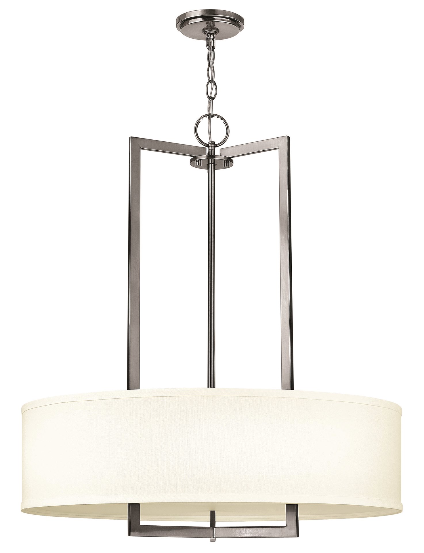 Hampton is a modern transitional design, offering the ultimate in urban sophistication. The minimal rectangular frame, paired with a decorative acrylic etched bottom lens, is softened by a contemporary off-white linen drum shade.