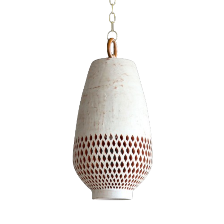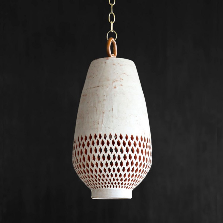 Using a red clay that comes from local mountains, the pendant lights in this collection are first given form within custom gesso molds. Emerging from the molds, the repeating openwork designs—which play on motifs that are carved in to the stone at Mitla, the neighboring archeological ruins—are meticulously cut out one by one. Each piece is then treated with a finish before entering into a final kiln firing.