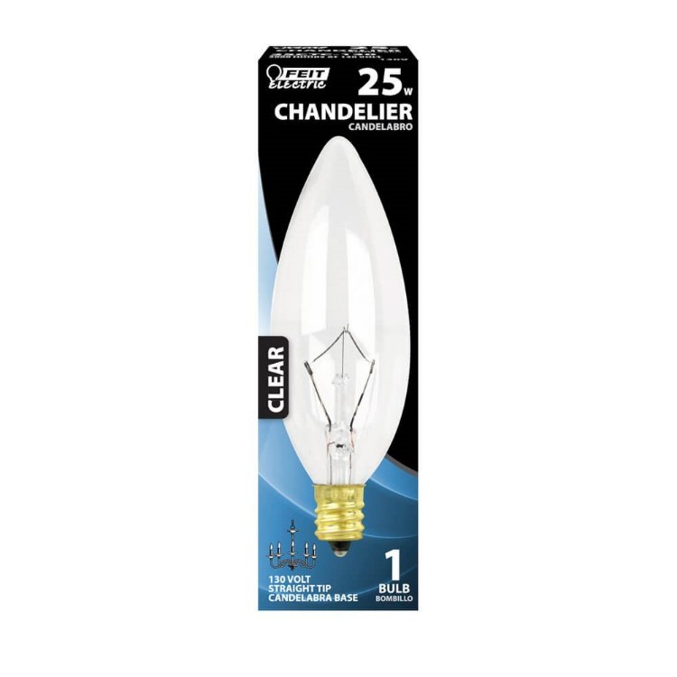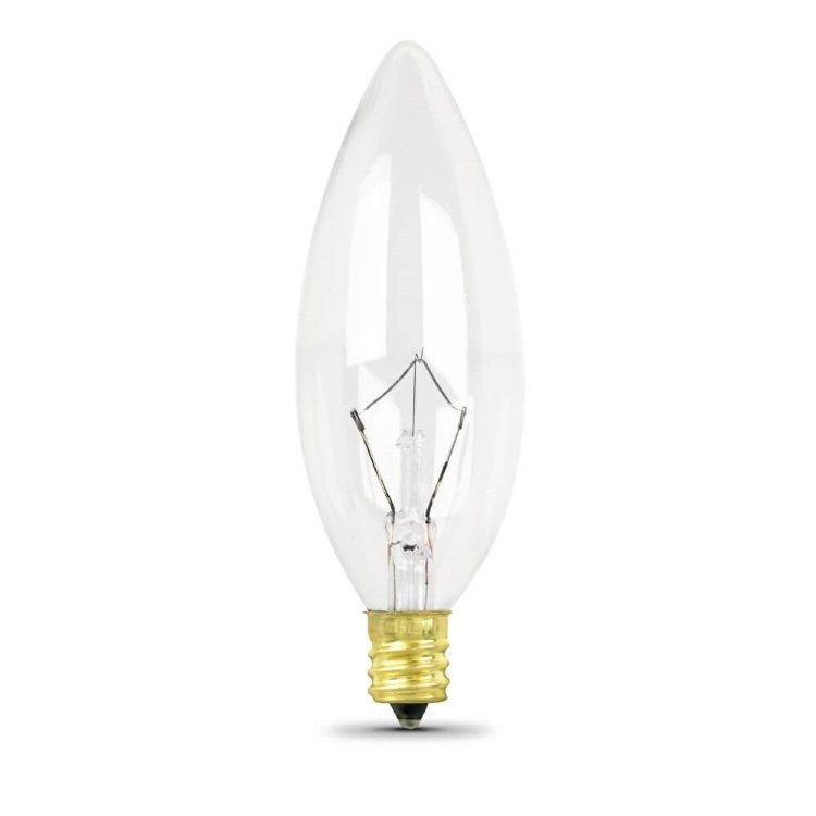 25-Watt Torpedo Tip clear incandescent chandelier light bulb with a candelabra base.