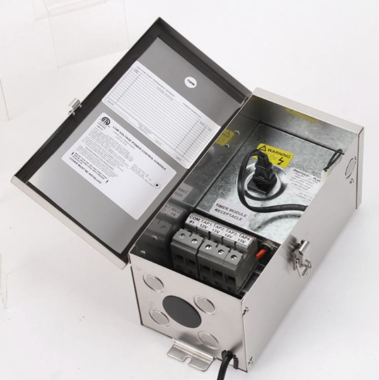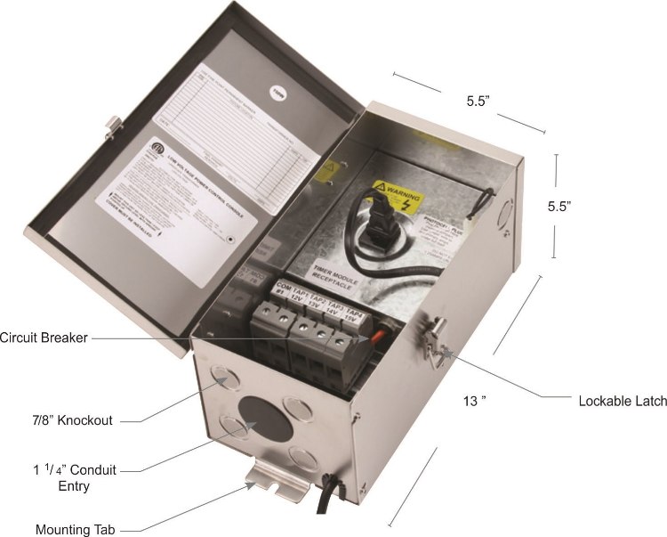 Stainless steel enclosure is rain-tight with hinged lockable cover and multiple knockouts throughout bottom and sides. Features include removable timer and field installed photocell. All units “plug and go” ready for field install accessories.