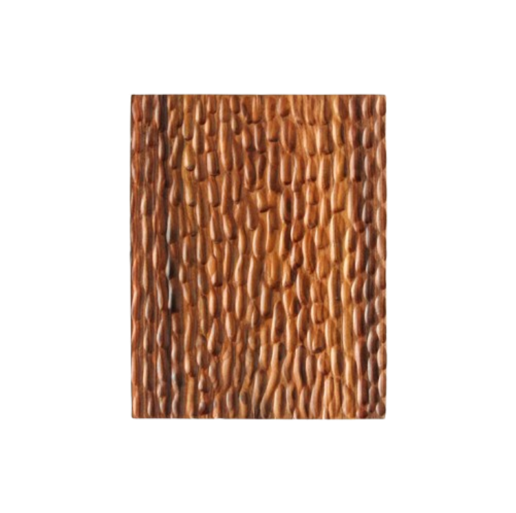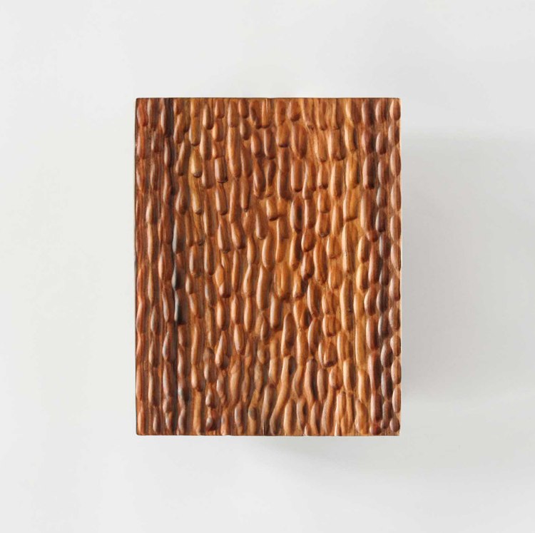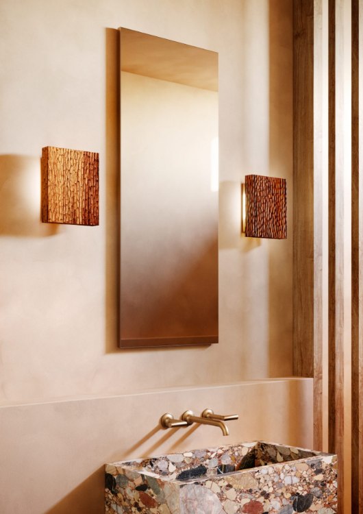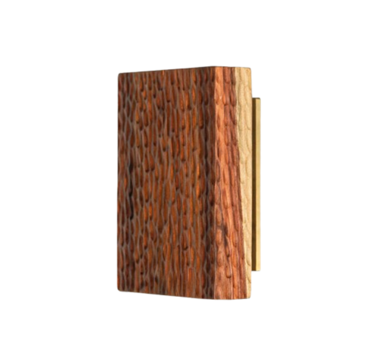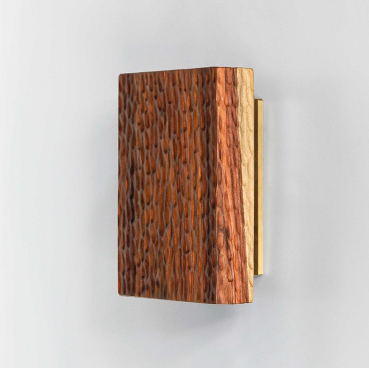 Formed from a sustainably harvested and certified local tropical hardwoods, the face of each sconce is meticulously chiseled to create a pattern of striking undulations. The wood blocks are backed with polished brass for textural contrast—enhancing the way the light casts from both the base and peak of the fixture.